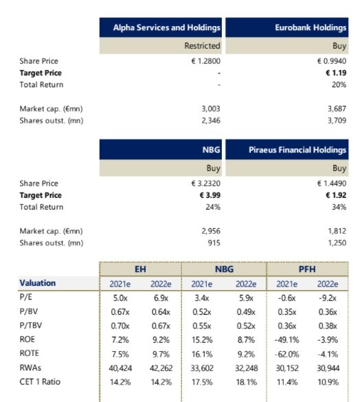 Μεταξύ των τραπεζών, η AF συνεχίζει να προτιμά την Εθνική Τράπεζα, την οποία και θεωρεί κορυφαία στον ελληνικό τραπεζικό τομέα. Η Eurobank είναι ελαφρώς πιο μπροστά όσον αφορά την εξυγίανση των NPE και διαθέτει ένα γεωγραφικά ισορροπημένο προφίλ κερδοφορίας. Η Πειραιώς έχει σημειώσει μια αξιοσημείωτη επιστροφή (με στόχο για το μονοψήφιο δείκτη NPE στις αρχές του 2022), ωστόσο, εξακολουθεί να διαπραγματεύεται σε έκπτωση σε όρους P/TBV το οποίο δικαιολογείται πιθανώς λόγω των χαμηλότερων κεφαλαιακών αποθεμάτων.