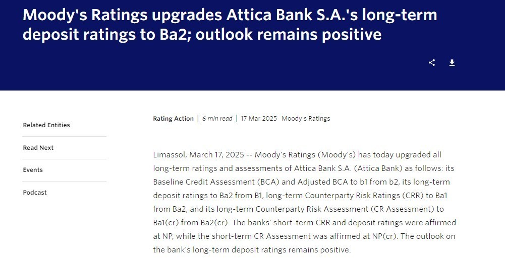 Σε αναβάθμιση της Attica Bank στη βαθμίδα Ba2 από B1 προχώρησε η Moody’s, διατηρώντας θετικές προοπτικές για την τράπεζα.