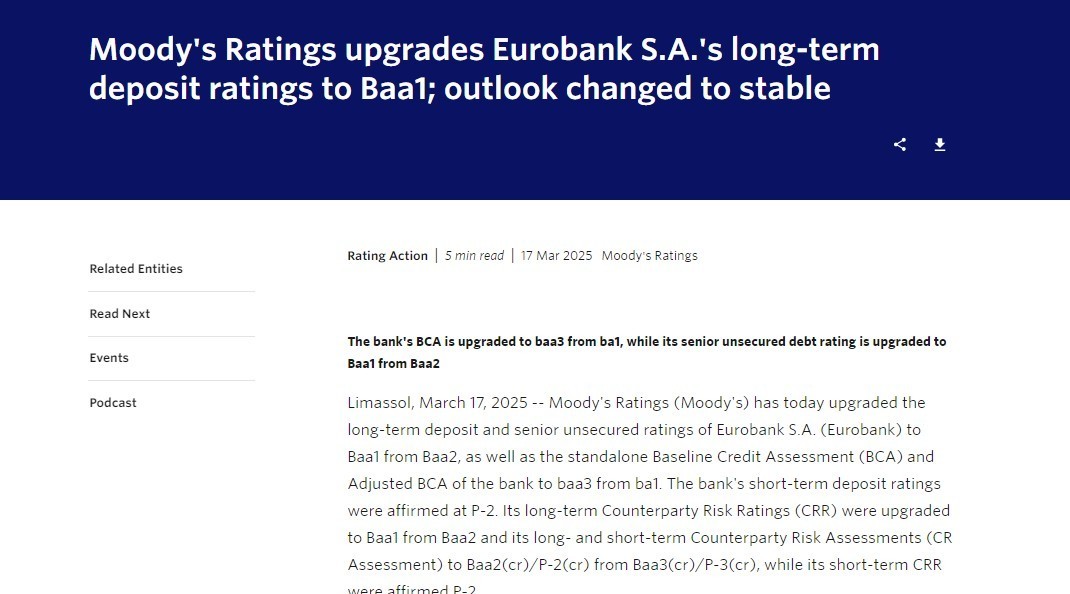 Η κίνηση αυτή ακολουθεί την πρόσφατη αναβάθμιση της πιστοληπτικής ικανότητας του Ελληνικού Δημοσίου σε επενδυτική βαθμίδα (Baa3) από Ba1, καθώς η αξιολόγηση της τράπεζας επηρεαζόταν από την κρατική βαθμολογία λόγω της μεγάλης έκθεσής της σε ελληνικά κρατικά ομόλογα.