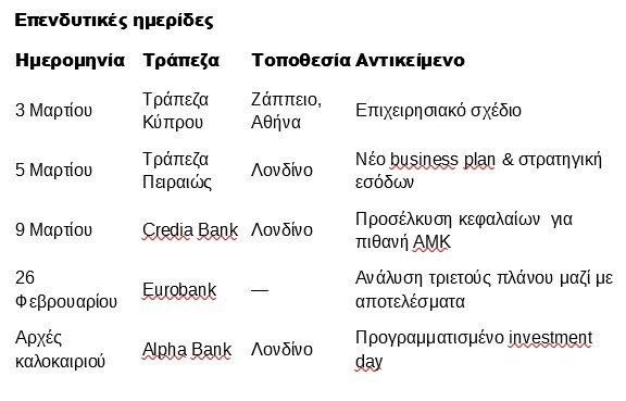 Κατά τα λοιπά είναι γνωστό πως investment day προγραμματίζει η Alpha Bank αρχές του καλοκαιριού επίσης στο Λονδίνο ενώ δεν έχει κάτι καταγραφεί σε ότι αφορά την Εθνική.