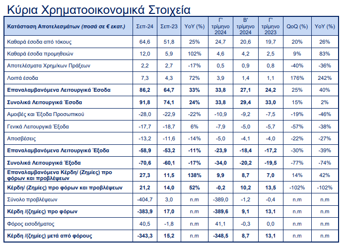 Τέλος, σε επίπεδο καθαρού αποτελέσματος, ο Όμιλος ανακοίνωσε ζημίες ύψους €343,3 εκατ. για το εννεάμηνο του 2024, καθώς το αποτέλεσμα επιβαρύνθηκε από τις προβλέψεις, ύψους περίπου €385 εκατ. για την υπαγωγή του χαρτοφυλακίου Domus στο πρόγραμμα κρατικών εγγυήσεων «Ηρακλής», καθώς και από μη επαναλαμβανόμενα έξοδα ύψους €9,7 εκατ. που αφορούσαν σε ενέργειες και έργα στο πλαίσιο της συγχώνευσης με την Παγκρήτια Τράπεζα. Σημειώνουμε εδώ ότι οι αντίστοιχες ζημίες της Παγκρήτιας για το χαρτοφυλάκιο Rhodium, δεν επιβάρυναν το αποτέλεσμα, αλλά πέρασαν στην καθαρή θέση, συνεπεία της συγχώνευσης.