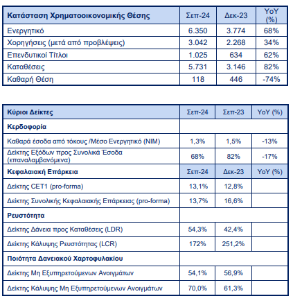 «Τα αποτελέσματα του 3ου τριμήνου 2024 είναι τα πρώτα αποτελέσματα μετά την ολοκλήρωση της συγχώνευσης με την Παγκρήτια Τράπεζα και αποτυπώνουν τόσο την αφετηρία αλλά και τη δυναμική της νέας Τράπεζας. Ο συνδυασμός των δύο Τραπεζών δημιούργησε μια Τράπεζα με πανελλαδικό αποτύπωμα, ισχυρή ρευστότητα, συμπληρωματική εμπορική δραστηριότητα, ευρεία πελατειακή βάση και αξιόλογο ανθρώπινο δυναμικό. Έχοντας πλέον ολοκληρώσει με επιτυχία και την Αύξηση Μετοχικού Κεφαλαίου, αναμένουμε μόνο την οριστική εξυγίανση της Τράπεζας προ τα τέλη του έτους, κάνοντας χρήση του προγράμματος εγγυήσεων “Ηρακλής ΙΙΙ”, προκειμένου να έχουμε υλοποιήσει πλήρως τη Συμφωνία Μετόχων. Ο στόχος το 2025 είναι να ολοκληρώσουμε και τη λειτουργική συγχώνευση, ώστε να επιτύχουμε τόσο τις προσδοκώμενες συνέργειες και εξοικονόμηση κόστους λειτουργίας, όσο και να προσφέρουμε στους πελάτες μας μια ενιαία εμπειρία, κοινά ανταγωνιστικά προϊόντα και να συνεχίζουμε να στηρίζουμε με ολοκληρωμένες λύσεις τόσο την ιδιωτική όσο και την επιχειρηματική τους δραστηριότητα».