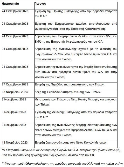 Το προβλεπόμενο χρονοδιάγραμμα για την έναρξη διαπραγμάτευσης των Τίτλων και των Νέων Κοινών Μετοχών έχει ως εξής: