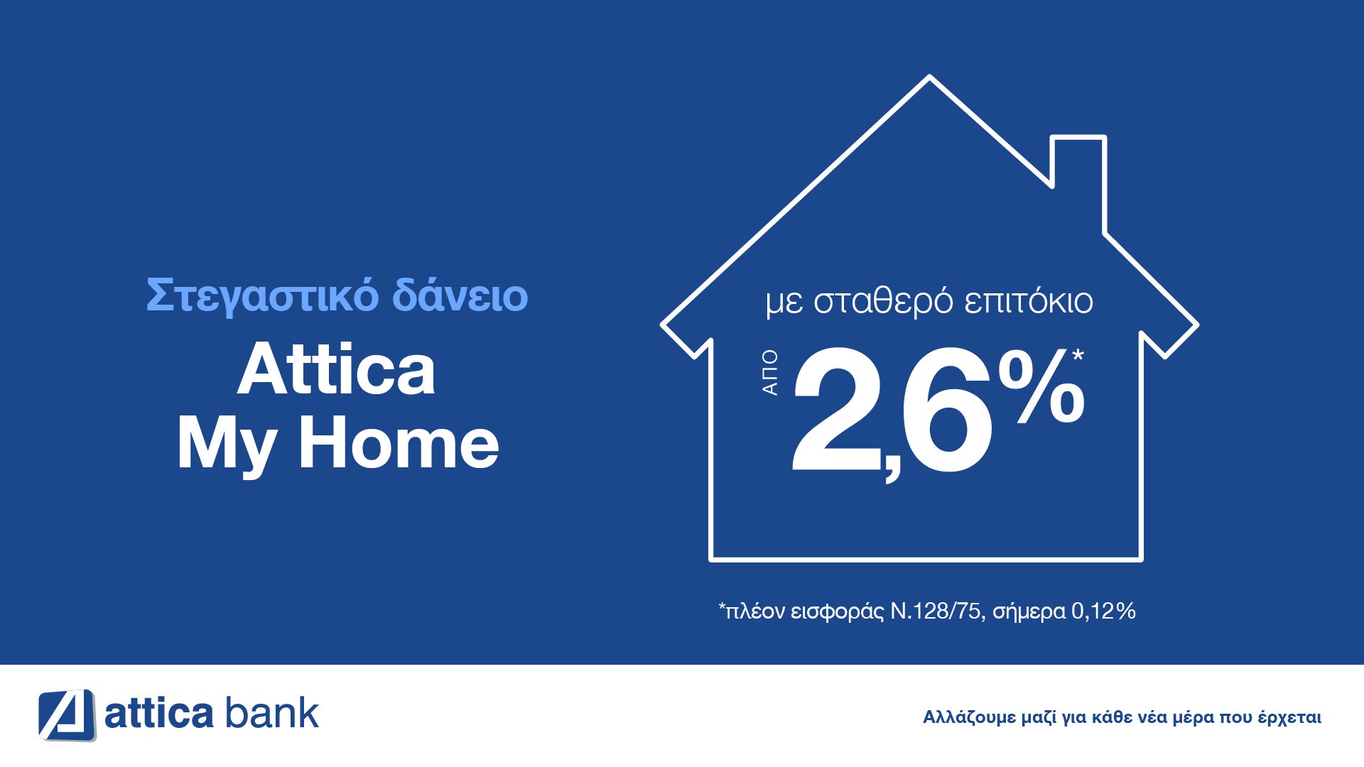 Και δεν υπάρχει καλύτερη στιγμή από το τώρα. Γιατί το Στεγαστικό Δάνειο Attica My Home μειώνει το σταθερό επιτόκιό του στο 2,6%, ενώ παράλληλα διαθέτει ευνοϊκούς όρους χρηματοδότησης . Το Attica My Home σάς καλύπτει για αγορά κατοικίας ή εργασίες ανέγερσης, αποπεράτωσης, επέκτασης ανακαίνισης ή επισκευής της κατοικίας σας, ή για αγορά οικοπέδου με σκοπό την ανέγερση.