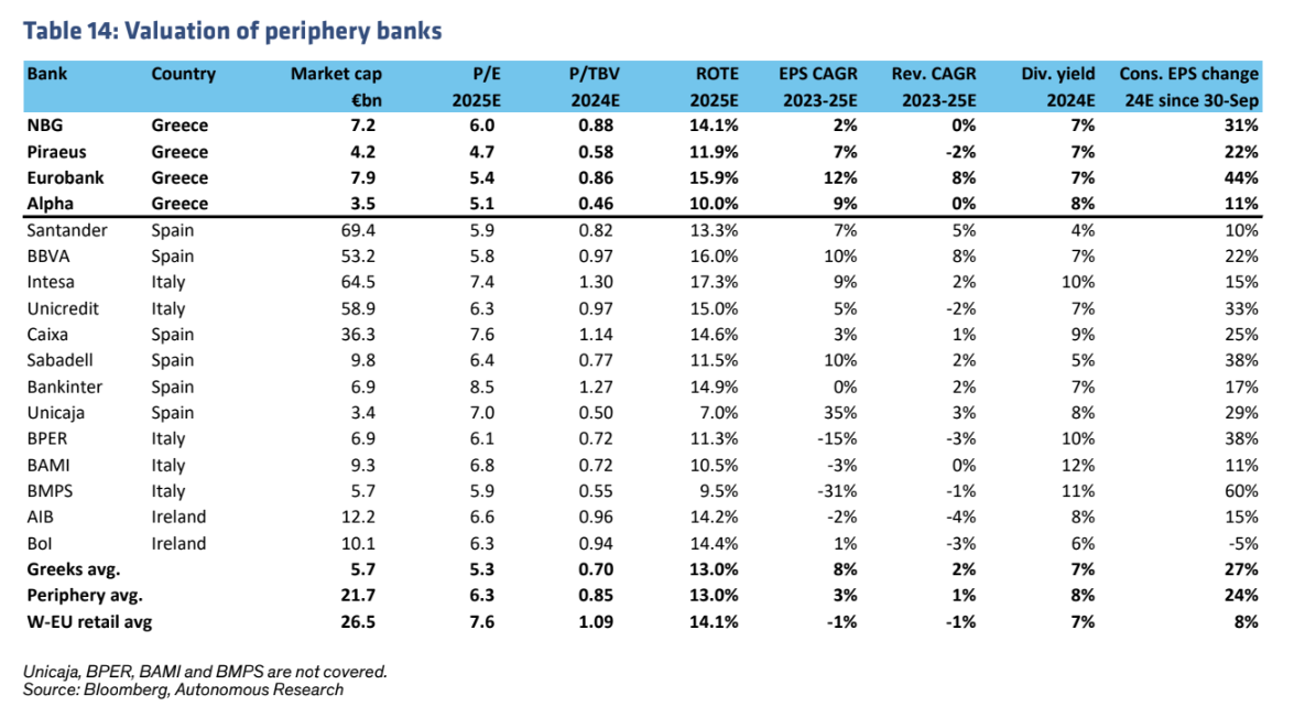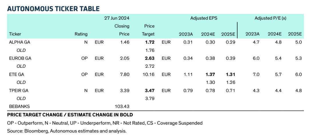 «Αναμένουμε ότι οι ελληνικές τράπεζες θα μετατραπούν σε συνεπείς μετοχικές επενδύσεις μετά από μια μακρά περίοδο καταστροφής της αξίας. Υποθέτουμε ότι η πρόσφατη αναβάθμιση των προβλέψεων της Τράπεζας Πειραιώς για το 2024 θα ακολουθηθεί από τις υπόλοιπες στις ανακοινώσεις του δεύτερου τριμήνου. Προτιμούμε να ‘παίξουμε’ στην Ελλάδα μέσω της Εθνικής Τράπεζας, καθώς διαθέτει ένα από τα καλύτερα franchise καταθέσεων στην Ευρώπη και τη Eurobank, όπου πιστεύουμε ότι η άνοδος από την εξαγορά του Ελληνικού υποτιμάται.», εξηγούν οι αναλυτές της Autonomous Research.