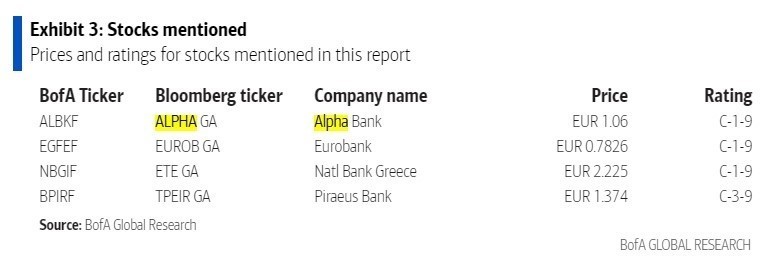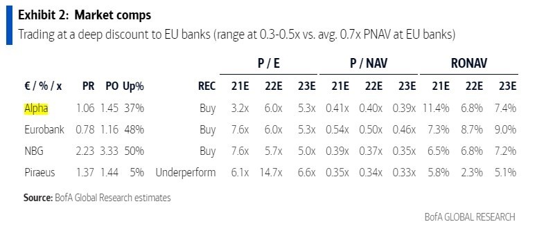 Οι τράπεζες με ιδιαίτερα χαμηλό πολλαπλασιαστή τιμής προς κέρδη (P/E), στις 8 φορές ή χαμηλότερα το 2023, περιλαμβάνουν τις ακόλουθες: Eurobank BNP, CASA, UBS, Barclays, NatWest, Raiffeisen, οι ελληνικές τράπεζες και οι ιρλανδικές και συνολικά η BofA επαναλαμβάνει τη θετική άποψή της για τον κλάδο. Αναλυτικά: