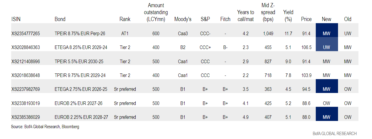 Η BofA υποβαθμίζει σε marketweight τα ομόλογα με κουπόνι 2,25% της Eurobank 2,75% της Εθνικής Τράπεζας της Ελλάδος, υποβαθμίζει το ομόλογο με κουπόνι 8,25% Tier2 ΕΤΕ σε underweight λόγω μη ελκυστικής σχετικής αξίας, αναβαθμίζουμε το AT1 ομόλογο της Πειραιώς σε marketweight λόγω βελτίωσης των κεφαλαίων και της αποτίμησης και διατηρούμε το overweight για τα ομόλογα της Eurobank με επιτόκιο 2%.