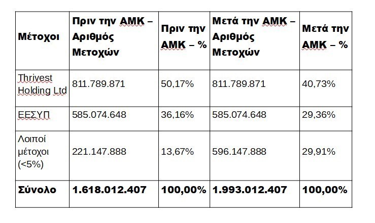 Η κεφαλαιακή ενίσχυση ολοκληρώθηκε με απόλυτη επιτυχία χωρίς τη συμμετοχή των υφιστάμενων βασικών μετόχων, γεγονός που εξυπηρέτησε ένα διπλό στόχο: αφενός τη χρηματοδότηση του επιχειρησιακού σχεδίου της Credia και αφετέρου τη βελτίωση της διασποράς των μετοχών (free float). Ως αποτέλεσμα, το ποσοστό της Thrivest Holding Ltd διαμορφώθηκε στο 40,73%, ενώ το ποσοστό της ΕΕΣΥΠ (Υπερταμείο) μειώθηκε στο 29,36%. Παρά τη μείωση, το Υπερταμείο εξακολουθεί να διατηρεί ειδικά δικαιώματα στην τράπεζα, διασφαλίζοντας έναν βαθμό επιρροής στη στρατηγική της.