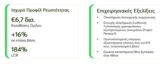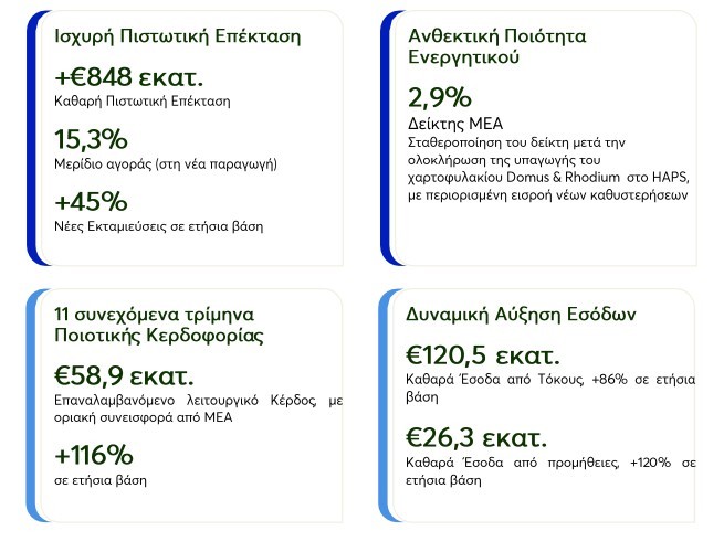 • Τα επαναλαμβανόμενα κέρδη προ προβλέψεων σημείωσαν νέο ιστορικό υψηλό και ανήλθαν σε €58 ,9 εκατ., στο εννεάμηνο 2025, αυξημένα κατά 116% σε ετήσια βάση , καταγράφοντας αύξηση για 11 συνεχή τρίμηνα . Τα επαναλαμβανόμενα κέρδη προ φόρων διαμορφώθηκαν στα €40 ,8 εκατ. για το εννεάμηνο 2025 έναντι μόλις €2,2 εκατ. κατά την αντίστοιχη συγκριτική περίοδο , λόγω της ισχυρής αύξησης των οργανικών εσόδων .
