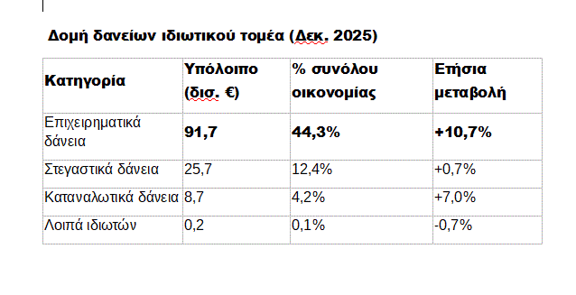 Το 2025 κλείνει με σαφή επιτάχυνση της πιστωτικής επέκτασης στην εγχώρια οικονομία, με το σύνολο των υπολοίπων δανείων να αυξάνεται από 201,3 δισ. ευρώ τον Οκτώβριο σε 207,2 δισ. ευρώ τον Δεκέμβριο, καταγράφοντας άνοδο 5,8 δισ. ευρώ σε επίπεδο τριμήνου και ετήσιο ρυθμό αύξησης 5,5%. Περίπου τα δύο τρίτα της χρηματοδότησης κατευθύνονται στον ιδιωτικό τομέα (130,1 δισ. ευρώ ή 62,8%), ο οποίος αποτελεί τον βασικό μοχλό της ανόδου, ενώ η γενική κυβέρνηση διαμορφώνεται στα 77,1 δισ. ευρώ.