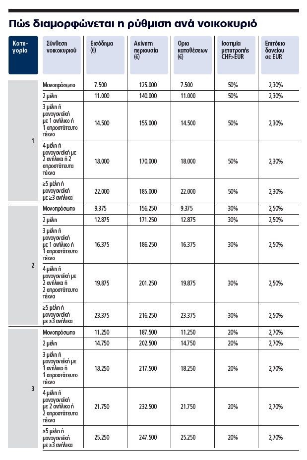 Μια ρύθμιση που έρχεται να αντιμετωπίσει ένα χρόνιο πρόβλημα, αυτό των δανειοληπτών σε ελβετικό φράγκο, διαμόρφωσε το υπουργείο Εθνικής Οικονομίας και Οικονομικών. Η αρχιτεκτονική της ρύθμισης καλύπτει το σύνολο των δανειοληπτών και τους αντιμετωπίζει με βάση τα εισοδήματα και τα περιουσιακά τους στοιχεία, χωρίς να προβλέπεται οποιουδήποτε είδους κόφτης που να συνδέεται με το ενέχυρο του δανείου. Σημαντικό πλεονέκτημα έναντι των ρυθμίσεων που είχαν προσφέρει στο παρελθόν οι τράπεζες είναι ότι η παρούσα ρύθμιση τους αφορά όλους, συμπεριλαμβανομένης και μιας μερίδας πολιτών που διαθέτουν εισοδήματα και περιουσία, αλλά υφίστανται, όπως και οι υπόλοιποι, την έντονη «αδικία» να έχουν λάβει ένα δάνειο, να εξυπηρετούν κανονικά τις δόσεις του και, παρά ταύτα, το κεφάλαιο να παραμένει ουσιαστικά αμείωτο.