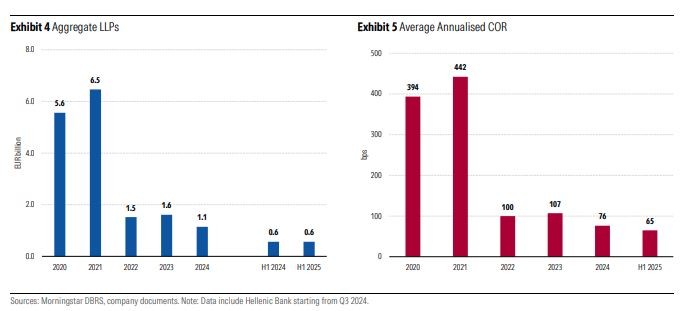 Κατά το πρώτο εξάμηνο του 2025, οι προβλέψεις για ζημίες από δάνεια (LLPs) παρέμειναν ουσιαστικά σταθερές σε ετήσια βάση, καθώς οι κίνδυνοι δανείων έχουν σταθεροποιηθεί και ο σχηματισμός νέων μη εξυπηρετούμενων ανοιγμάτων (NPEs) παρέμεινε σε χαμηλά επίπεδα. Το μέσο κόστος κινδύνου (COR) διαμορφώθηκε στις 65 μονάδες βάσης για το α’ εξάμηνο του 2025, χαμηλότερο σε σύγκριση με τα επίπεδα των προηγούμενων ετών, γεγονός που υποστηρίχθηκε επίσης από την ισχυρή πιστωτική ανάπτυξη
