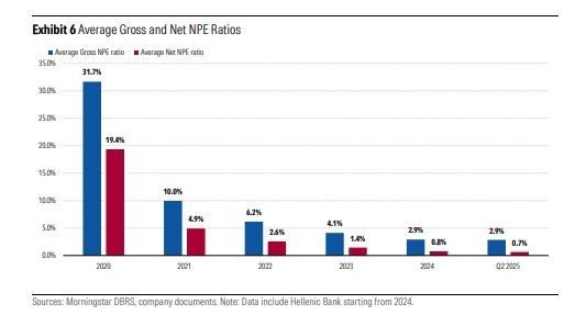 Στο τέλος Ιουνίου 2025, ο μέσος μικτός δείκτης NPE διαμορφώθηκε στο 2,9% και ο καθαρός δείκτης στο 0,7%, έναντι 2,9% και 0,8% αντίστοιχα στο τέλος του 2024 (βλ. Διάγραμμα 6). Το μέσο ποσοστό κάλυψης των NPEs με βάση τις συνολικές προβλέψεις αυξήθηκε στο περίπου 78%, από 74% την ίδια περίοδο.