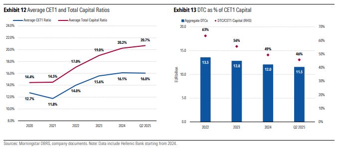 Η ποιότητα του κεφαλαίου βελτιώθηκε περαιτέρω στο πρώτο εξάμηνο του 2025, κυρίως λόγω της ταχύτερης απομείωσης των αναβαλλόμενων φορολογικών απαιτήσεων (DTC), στο πλαίσιο του νέου πλαισίου που εφαρμόζεται από το 2025. Στο τέλος Ιουνίου, οι DTCs αντιστοιχούσαν περίπου στο 46% του κεφαλαίου CET1, μειωμένες από 49% στο τέλος του 2024.