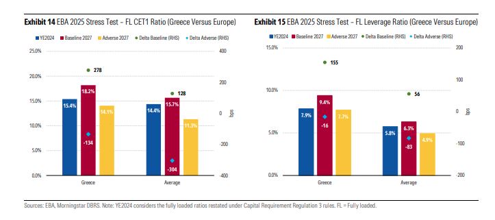 Η ευνοϊκή σύγκριση ισχύει επίσης και για τον πλήρως φορτωμένο δείκτη μόχλευσης, με αρνητική επίπτωση περίπου 16 μονάδων βάσης το 2027 στο δυσμενές σενάριο για τις ελληνικές τράπεζες, έναντι 80 μονάδων βάσης για τον ευρωπαϊκό μέσο όρο.