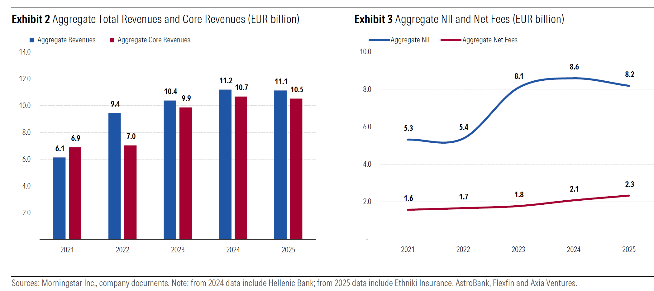 Τα καθαρά έσοδα από τόκους μειώθηκαν περίπου 5% σε ετήσια βάση, αντανακλώντας την αλλαγή του επιτοκιακού κύκλου. Ωστόσο, η ισχυρή πιστωτική επέκταση, η χρήση εργαλείων αντιστάθμισης επιτοκιακού κινδύνου και η βελτιωμένη διαχείριση ισολογισμού περιόρισαν την επίδραση της πτώσης των επιτοκίων.