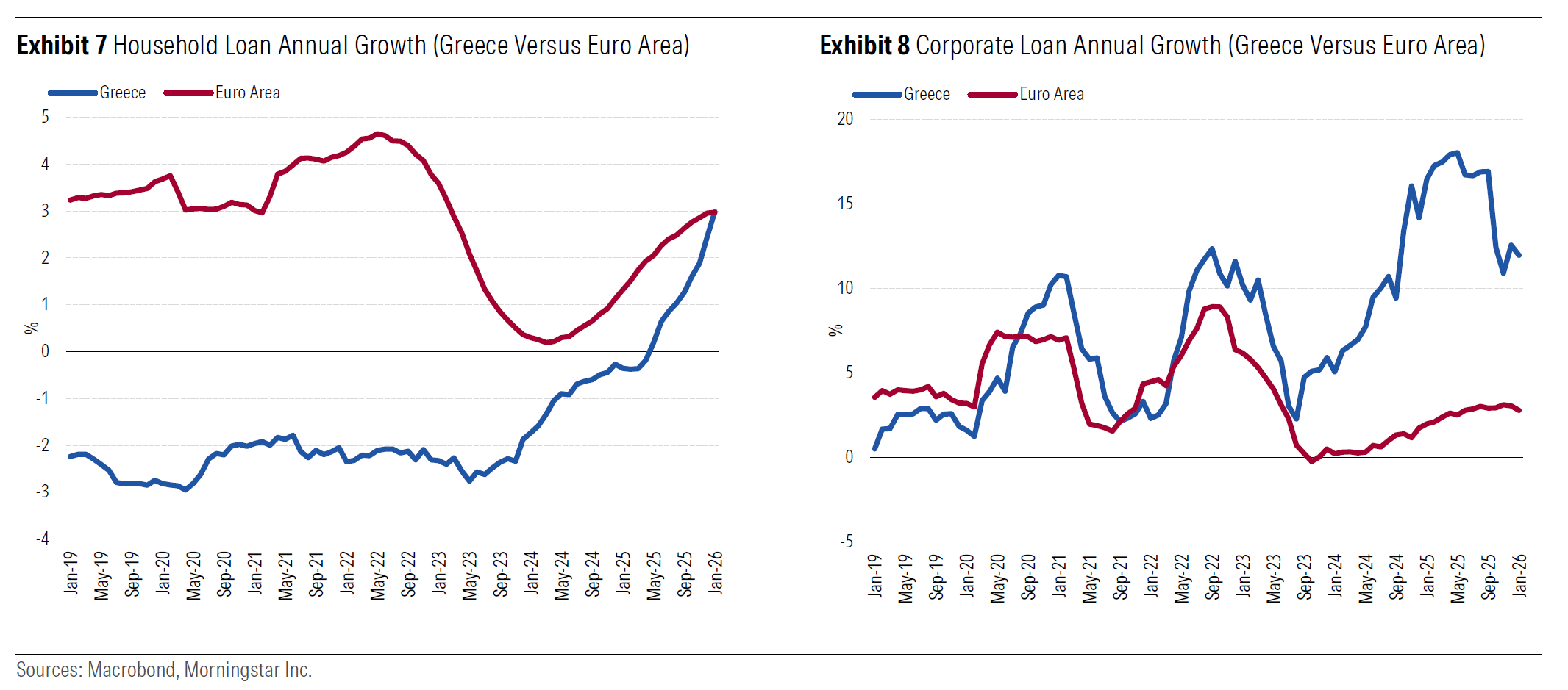Παράλληλα, τα δάνεια προς τα νοικοκυριά επιταχύνθηκαν και αυξάνονται πλέον περίπου 3% σε ετήσια βάση, γεγονός που δείχνει σταδιακή ανάκαμψη της λιανικής τραπεζικής.