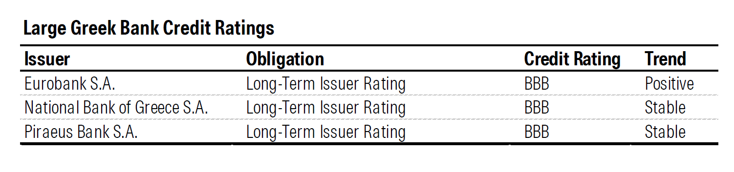 Σε επίπεδο πιστοληπτικής αξιολόγησης, η Morningstar DBRS διατηρεί τις μεγάλες ελληνικές τράπεζες στην επενδυτική βαθμίδα. Συγκεκριμένα, η Eurobank διαθέτει μακροπρόθεσμη αξιολόγηση εκδότη BBB με θετική προοπτική, ενώ η Εθνική Τράπεζα και η Τράπεζα Πειραιώς αξιολογούνται επίσης με BBB, αλλά με σταθερή προοπτική. Οι αξιολογήσεις αυτές αντικατοπτρίζουν την ισχυρή κερδοφορία των τελευταίων ετών, τη βελτίωση της ποιότητας ενεργητικού και την ενίσχυση των κεφαλαιακών «μαξιλαριών», παρά το πιο απαιτητικό διεθνές περιβάλλον που διαμορφώνεται για το 2026.