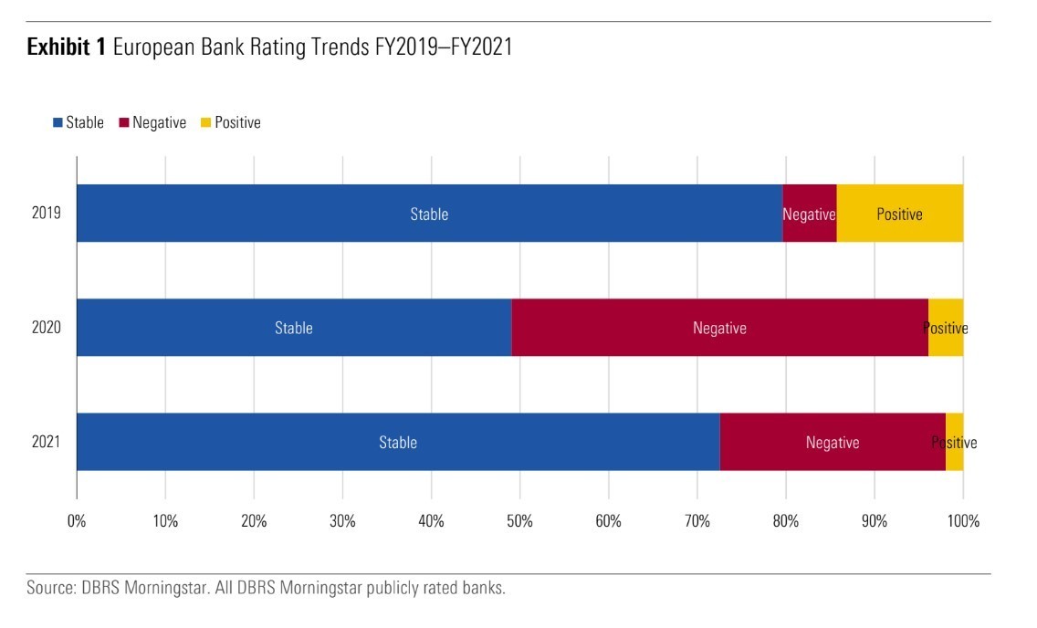 Τις προοπτικές των ευρωπαϊκών τραπεζών για το 2022 εξετάζει η DBRS Morningstar σε σημερινή της έκθεση, αναφέροντας ότι η αντιστροφή, το 2021, αρκετών από τις καθοδικές τάσεις που είχαν εμφανιστεί στον κλάδο με την έναρξη της πανδημίας θα έχει ως αποτέλεσμα τη σταθεροποίηση των προοπτικών τους.