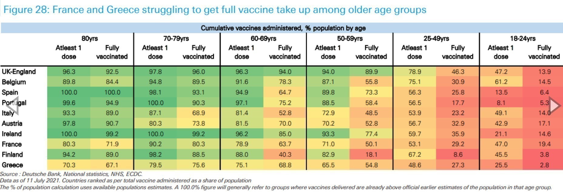 Σύμφωνα με τη γερμανική τράπεζα, η Ελλάδα είναι στις τελευταίες χώρες στην Ευρώπη σε ό,τι αφορά τους εμβολιασμούς, απέχοντας περίπου 15% από τις πρώτες σε επιδόσεις χώρες, σε ό,τι αφορά τον συνολικό αριθμό των δόσεων που έχουν χορηγηθεί ως ποσοστό του πληθυσμού. Η Ελλάδα εμφανίζει το χαμηλότερο ποσοστά εμβολιασμένων στις ηλικίες 80 και άνω με μόλις 67,1% πλήρως εμβολιασμένων έναντι 89% για τη Φινλανδία, 100% για την Ισπανία, 94,9% για την Πορτογαλία και 71,9% για τη Γαλλία που μαζί με τη χώρα μας είναι ουραγοί σε αυτήν την ηλικιακή κατηγορία. Ακόμα όμως και τις ηλικίες 70-79 ετών, η Ελλάδα επίσης είναι η τελευταία από τις χώρες που εμφανίζει η λίστα της Deutsche Bank στη μελέτη της με μόλις 75,6% του πληθυσμού εμβολιασμένων με την Ιταλία και την Αυστρία να βρίσκονται μόνο σε χειρότερη θέση. Αντίθετα, η χώρα είναι σε υψηλότερο επίπεδο στις ηλικίες 60-69 ετών και υψηλότερα από το μέσο όρο. Στις μικρές ηλικίες 18-24 ετών η Ελλάδα εμφανίζει το μικρότερο ποσοστό εμβολιασμών με μόλις 2,8% και στις παραγωγικές ηλικίες 25-49 ετών το ποσοστό είναι 27,3% έναντι π.χ. 17,7% στην Πορτογαλία, 23,2% στην Ιταλία και 25,8% στην Ισπανία αλλά και 8,6% στη Φιλανδία.