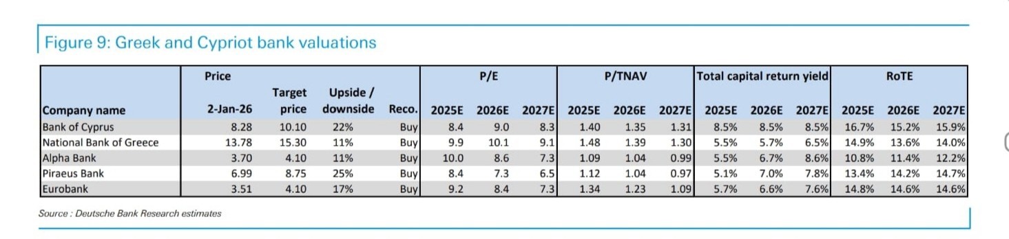 Παρότι οι μετοχές των ελληνικών τραπεζών έχουν γενικά υπεραποδώσει έναντι του ευρωπαϊκού τραπεζικού δείκτη, η αποτίμησή τους είναι χαμηλότερη σε σχέση με τον μέσο όρο των ευρωπαϊκών τραπεζών. Επιπλέον, η DB εκτιμά ότι συγκαταλέγονται μεταξύ εκείνων με τις καλύτερες προοπτικές μακροπρόθεσμης αύξησης των κερδών ανά μετοχή (EPS), κυρίως λόγω της ισχυρής πιστωτικής επέκτασης και των ανθεκτικών περιθωρίων πελατών, μετά την ολοκλήρωση της ανατιμολόγησης σε χαμηλότερα επιτόκια. Θεωρείται επίσης ότι η Κύπρος συγκαταλέγεται στις πλέον ευνοϊκά τοποθετημένες αγορές ως προς την ανάπτυξη και την κερδοφορία.