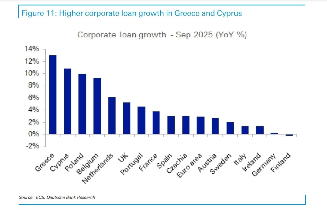 Οι ελληνικές και κυπριακές τράπεζες παρουσίασαν ισχυρή επίδοση, υπερβαίνοντας σταθερά τις προσδοκίες, με αμφότερες τις αγορές να ξεχωρίζουν έντονα σε επίπεδο δραστηριότητας, ενώ στην Ελλάδα η πιστωτική επέκταση ξεπέρασε το 10% αναφέρει σε πρόσφατη έκθεσή της η Deutsche Bank. Η εξέλιξη αυτή οφείλεται κυρίως στη χρηματοδότηση επιχειρήσεων, η οποία στηρίζεται σε χρόνια υποεπένδυσης, γεγονός που, κατά την άποψή μας, καθιστά την τάση βιώσιμη. Αυτό επιτρέπει ταχύτερη από την αναμενόμενη ανάκαμψη των καθαρών εσόδων από τόκους (NII) και δημιουργεί ισχυρές προοπτικές μελλοντικής κερδοφορίας ανά μετοχή (EPS), υποστηριζόμενες επιπλέον από την αύξηση των προμηθειών, την υψηλή λειτουργική αποδοτικότητα και τη μείωση των προβλέψεων.