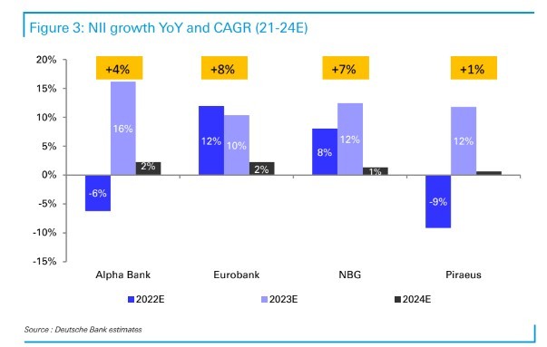 Η άνοδος των επιτοκίων έχει ενισχύσει τα καθαρά έσοδα από τόκους (ΝΙΙ) και, παρά το γεγονός ότι πιθανόν να είναι κάπως πιο βραχύβια από ό,τι σε άλλες χώρες (δεδομένου ότι τα δάνεια ανατιμολογούνται ταχύτερα), η αύξηση του όγκου στην Ελλάδα είναι ένας σαφής νικητής και μια σπάνια κινητήρια δύναμη που δεν μπορεί να βρεθεί αλλού στην Ευρώπη, στηρίζοντας έτσι τα έσοδα συνολικά. Το κόστος χρηματοδότησης (τόσο από καταθέσεις όσο και από τη χονδρική) θα μπορούσε να αποτελέσει τον κύριο μοχλό για κάποια σταθεροποίηση έως το 2024. Τούτου λεχθέντος, συνολικά οι αποδόσεις θα συνεχίσουν να βελτιώνονται με γνώμονα την ενδυνάμωση των συνολικών εσόδων, το έλεγχο στο κόστος την περιορισμένη επίπτωση στις προβλέψεις χάρη στην ανθεκτική ποιότητα του ενεργητικού.
