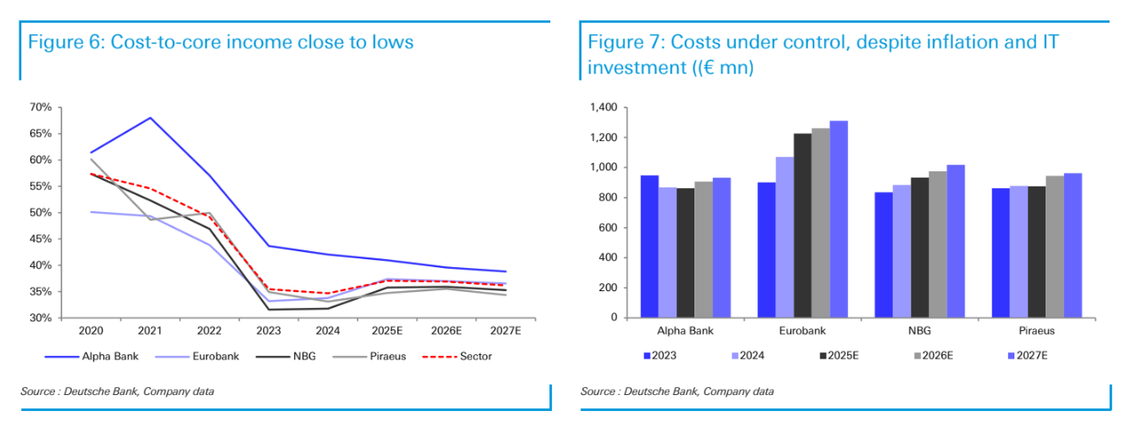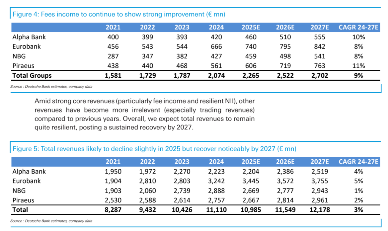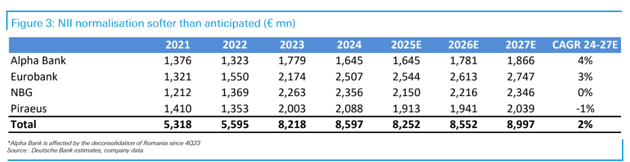 «Επιπρόσθετα, οι ελληνικές τράπεζες αναμένουν ότι θα μπορέσουν να διατηρήσουν την επέκταση της πιστωτικής επέκτασης σε υψηλό μονοψήφιο ποσοστό κατά τις επόμενες τρεις χρήσεις, υποστηριζόμενες κυρίως από τις επιχειρήσεις. Τα καθαρά έσοδα από τόκους θα έχουν πλήρως ανακάμψει έως το 2027, μετά από μια μέτρια πτώση το 2025 και θα σταθεροποιηθούν σχεδόν έως το 2026, ακόμη πιο γρήγορα από ότι έχει αποτυπωθεί στις αναβαθμίσεις των προβλέψεων των τραπεζών, οι οποίες, σε γενικές γραμμές, μας φαίνονται συντηρητικές», καταλήγει η Deutsche Bank.