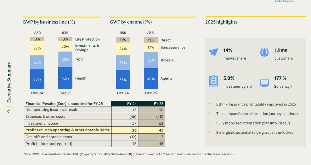 Η εταιρεία παρουσίασε σημαντική βελτίωση στην κερδοφορία το 2025, συνεχίζοντας την πορεία μετασχηματισμού της και την πλήρη ενσωμάτωσή της στη μητρική Τράπεζα Πειραιώς. Η ενεργή στρατηγική ενσωμάτωσης έχει δημιουργήσει νέες δυνατότητες για συνέργειες, βελτιστοποίηση κόστους και επέκταση προϊόντων, κάνοντας την ασφαλιστική δραστηριότητα έναν ζωτικό πυλώνα ανάπτυξης για την τράπεζα.