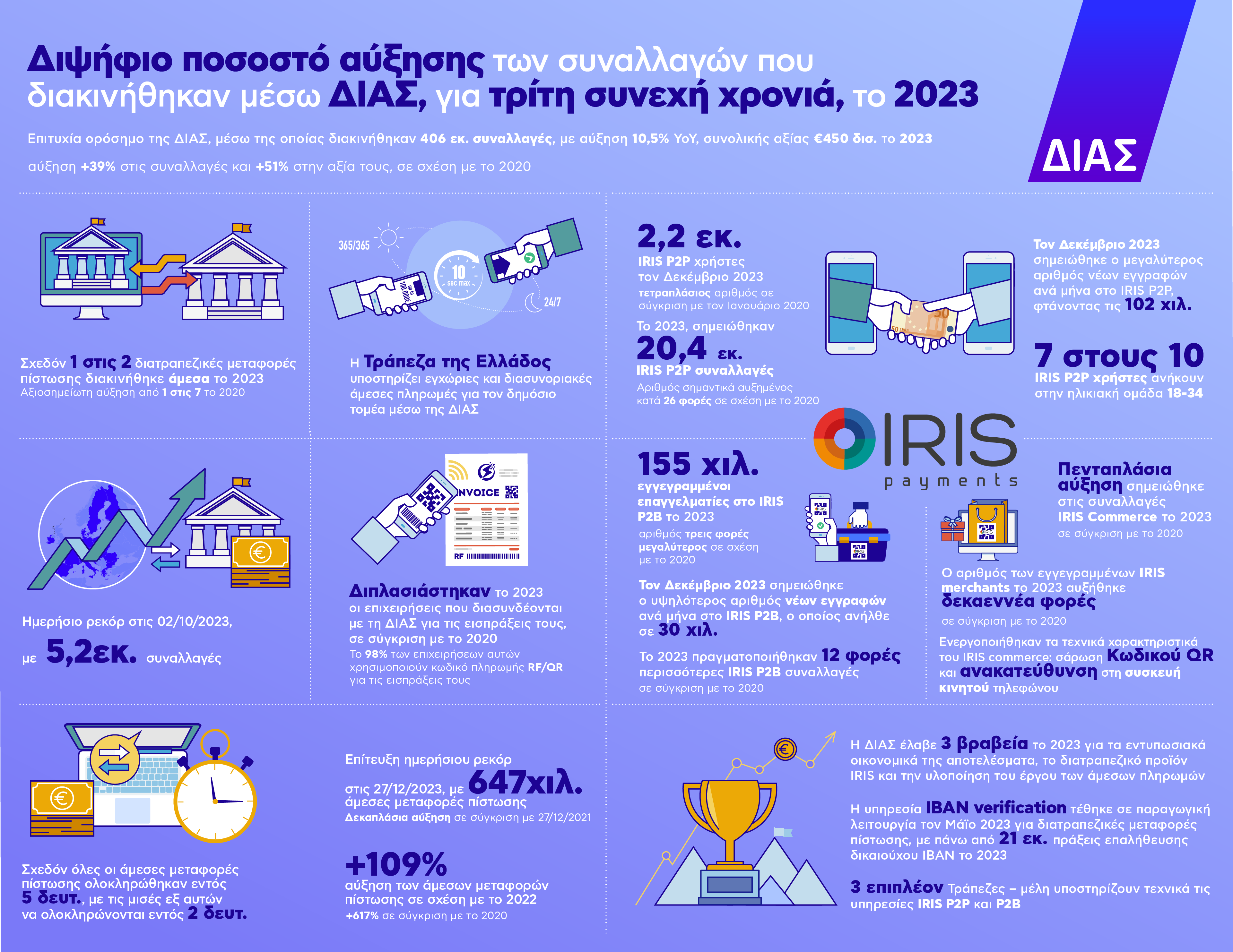 Το 2023 ενισχύθηκε σημαντικά η διατραπεζική υπηρεσία IRIS payments, η οποία παρέχεται από τις τράπεζες, σε συνεργασία με τη ΔΙΑΣ, με στόχο την εξασφάλιση συναλλαγών με ακόμη μεγαλύτερη ταχύτητα, ευκολία και ασφάλεια. Στα προϊόντα IRIS περιλαμβάνονται οι άμεσες μεταφορές χρημάτων μεταξύ φίλων (IRIS P2P), μεταξύ επαγγελματιών (IRIS P2B) και οι πληρωμές σε ηλεκτρονικό κατάστημα (IRIS eCommerce) που κατέγραψαν ισχυρούς ρυθμούς αύξησης συναλλαγών, ύψους 251%, 293% και 69% αντίστοιχα, σε σχέση με τα αντίστοιχα μεγέθη του 2022.