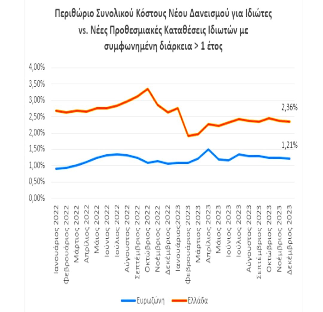 Στις προθεσμιακές καταθέσεις έως 1 έτος, το επιτόκιο στην Ελλάδα αυξήθηκε κατά 4 μονάδες βάσης (μ.β) και ανήλθε στο 1.83% (Νοέμβριος 2023: 1,79%) στους ιδιώτες και κατά 11 μ.β. στις επιχειρήσεις και ανήλθε στο 3,25% (Νοέμβριος 2023: 3,14%).