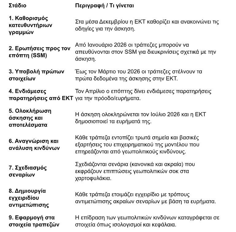 Για να διατηρηθεί η οικονομική αποδοτικότητα της άσκησης, η αντίστροφη δοκιμή ακραίων καταστάσεων γεωπολιτικού κινδύνου θα διεξαχθεί ως μέρος της εσωτερικής διαδικασίας αξιολόγησης κεφαλαιακής επάρκειας (ICAAP- Εσωτερική Διαδικασία Αξιολόγησης Κεφαλαιακής Επάρκειας) των τραπεζών του 2026.