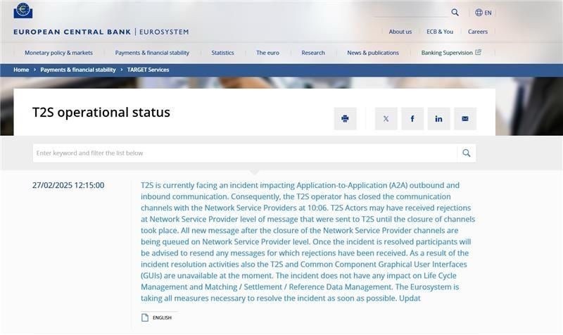 Ως αποτέλεσμα, ο διαχειριστής του T2S προχώρησε στο κλείσιμο των διαύλων επικοινωνίας με τους Παρόχους Υπηρεσιών Δικτύου (Network Service Providers) από το πρωί.