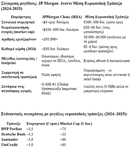 Η JP Morgan για παράδειγμα είναι 5 έως και 10 φορές μεγαλύτερη από μια μέση ευρωπαϊκή τράπεζα, τόσο σε ενεργητικό όσο και σε κερδοφορία.
