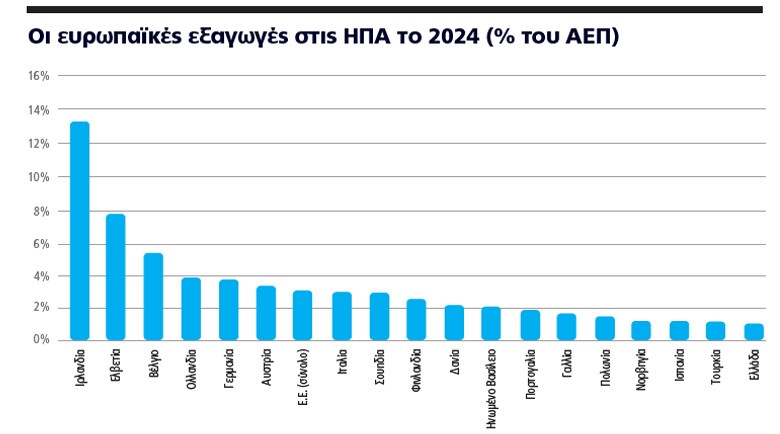Οι μεγαλύτεροι εξαγωγείς της Ευρωζώνης προς τις ΗΠΑ το 2024, σε απόλυτους όρους, ήταν η Γερμανία (161 δισ. ευρώ), η Ιρλανδία (72 δισ. ευρώ), η Ιταλία (64 δισ. ευρώ) και η Γαλλία (47 δισ. ευρώ). Οι ευρωπαϊκές χώρες με τη μεγαλύτερη έκθεση του ΑΕΠ στο εμπόριο με τις ΗΠΑ είναι η Ιρλανδία (13,5% ως ποσοστό του ΑΕΠ), το Βέλγιο (5,4%), η Ολλανδία (3,8%), η Γερμανία (3,7%) και η Ιταλία (3,0%). Η Πορτογαλία, η Γαλλία, η Ισπανία και η Ελλάδα είναι οι λιγότερο εκτεθειμένες (με εξαγωγές που δεν ξεπερνούν το 2% προς τις ΗΠΑ).