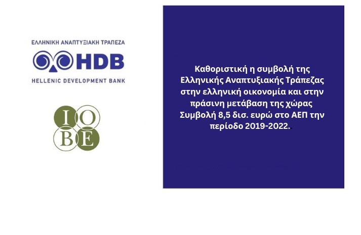 Τα σύγχρονα χρηματοδοτικά εργαλεία της Ελληνικής Αναπτυξιακής Τράπεζας HDB αποδεδειγμένα πλέον συμβάλλουν στον πράσινο μετασχηματισμό της μικρομεσαίας επιχειρηματικότητας, τη διατήρηση και αύξηση θέσεων εργασίας και στην ποιοτική αλλαγή του παραγωγικού μοντέλου της χώρας. Αυτό είναι το συμπέρασμα της τακτικής επιμέτρησης της συνεισφοράς της HDB που ολοκλήρωσε πρόσφατα το Ίδρυμα Οικονομικών και Βιομηχανικών Ερευνών (ΙΟΒΕ).