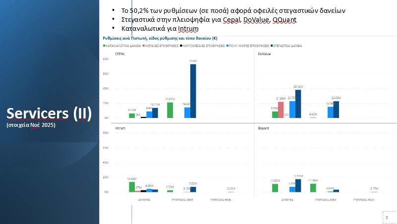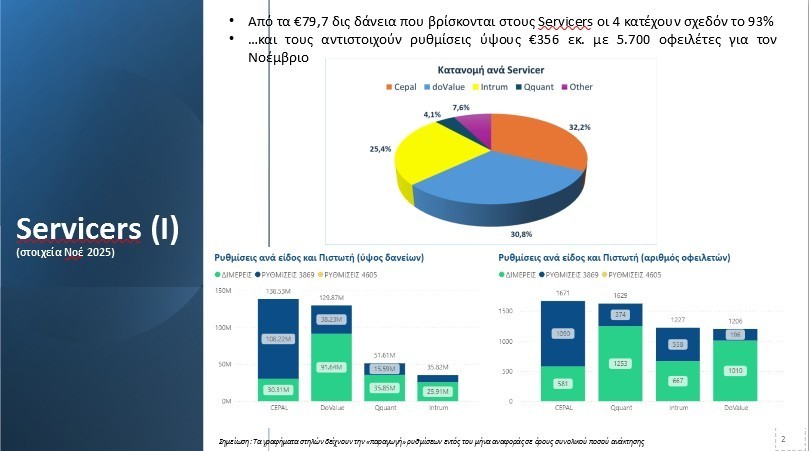 Στην ίδια κατεύθυνση, οι διμερείς ρυθμίσεις που υλοποιήθηκαν τον Νοέμβριο 2025 με τους 4 μεγαλύτερους Servicers (Intrum, Cepal, DoValue, Qquant) συνεχίζουν να παρουσιάζουν θετική δυναμική. Τον μήνα Νοέμβριο καταγράφηκαν ρυθμίσεις συνολικού ύψους 356 εκ. ευρώ, οι οποίες αντιστοιχούν σε 5.700 οφειλέτες, με την με την πλειοψηφία αυτών να αφορά στεγαστικά δάνεια.