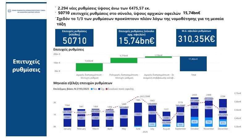 Συγκεκριμένα, τον μήνα Δεκέμβριο 2025, οι επιτυχείς ρυθμίσεις έφτασαν τις 2.294, εκ των οποίων: