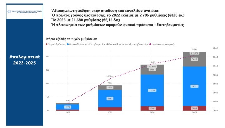 O 4ος χρόνος εφαρμογής του εργαλείου κλείνει με θεαματική αύξηση σε σχέση με τα προηγούμενα έτη. Αξίζει να σημειωθεί ότι κατά το 2022, πρώτο χρόνο λειτουργίας, επετεύχθησαν 2.706 ρυθμίσεις – αριθμός που σήμερα είναι πιο κοντά στις μηνιαίες ρυθμίσεις. Ενώ εντός του 2025 σημειώθηκαν 21.680 επιτυχείς αναδιαρθρώσεις. Συγκρίνοντας τις επιδόσεις των 2 ετών, η αύξηση είναι της τάξεως του 700%.