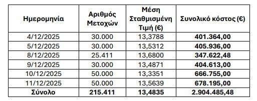 215.411 κοινές μετοχές της Τράπεζας που διαπραγματεύονται στο Χρηματιστήριο Αθηνών με μέση σταθμισμένη τιμή €13,4835 ανά μετοχή και με συνολικό κόστος €2.904.485,48.