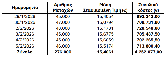 Η Εθνική Τράπεζα της Ελλάδος Α.Ε. («η Τράπεζα»), σε συνέχεια των αποφάσεων της από 30/05/2025 Τακτικής Γενικής Συνέλευσης των Μετόχων της και της από 04/06/2025 ανακοίνωσής της αναφορικά με την έναρξη υλοποίησης του πρώτου σκέλους του προγράμματος αγοράς ιδίων μετοχών που εγκρίθηκε από την ως άνω Γενική Συνέλευση (Σκέλος I), και κατόπιν της από 28/05/2025 σχετικής έγκρισης του Ενιαίου Εποπτικού Μηχανισμού (EEM) της Ευρωπαϊκής Κεντρικής Τράπεζας (ΕΚΤ) και των από 16/06/2025, 26/06/2025, 04/07/2025, 14/07/2025, 21/07/2025, 29/07/2025, 07/08/2025, 18/08/2025, 26/08/2025, 02/09/2025, 09/09/2025, 17/09/2025, 26/09/2025, 06/10/2025, 13/10/2025, 21/10/2025, 30/10/2025, 10/11/2025, 19/11/2025, 26/11/2025, 04/12/2025, 12/12/2025, 22/12/2025, 02/01/2026, 13/01/2026, 22/01/2026 και 30/01/2026 ανακοινώσεών της σχετικά με την αγορά ιδίων μετοχών, ανακοινώνει ότι κατά την περίοδο από 29/01/2026 έως και 05/02/2026 απέκτησε συνολικά 276.000 κοινές μετοχές της Τράπεζας (“Ίδιες Μετοχές”) που διαπραγματεύονται στο Χρηματιστήριο Αθηνών με μέση σταθμισμένη τιμή €15,4061 ανά μετοχή και με συνολικό κόστος €4.252.077,00.