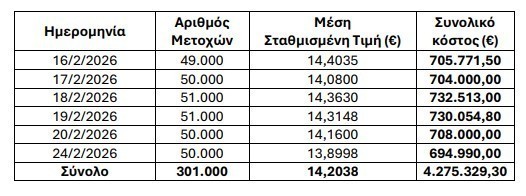 Η Εθνική Τράπεζα της Ελλάδος Α.Ε., σε συνέχεια των αποφάσεων της από 30/05/2025 Τακτικής Γενικής Συνέλευσης των Μετόχων της και της από 04/06/2025 ανακοίνωσής της αναφορικά με την έναρξη υλοποίησης του πρώτου σκέλους του προγράμματος αγοράς ιδίων μετοχών που εγκρίθηκε από την ως άνω Γενική Συνέλευση (Σκέλος I), και κατόπιν της από 28/05/2025 σχετικής έγκρισης του Ενιαίου Εποπτικού Μηχανισμού (EEM) της Ευρωπαϊκής Κεντρικής Τράπεζας (ΕΚΤ) και των από 16/06/2025, 26/06/2025, 04/07/2025, 14/07/2025, 21/07/2025, 29/07/2025, 07/08/2025, 18/08/2025, 26/08/2025, 02/09/2025, 09/09/2025, 17/09/2025, 26/09/2025, 06/10/2025, 13/10/2025, 21/10/2025, 30/10/2025, 10/11/2025, 19/11/2025, 26/11/2025, 04/12/2025, 12/12/2025, 22/12/2025, 02/01/2026, 13/01/2026, 22/01/2026, 30/01/2026, 09/02/2026 και 16/02/2026 ανακοινώσεών της σχετικά με την αγορά ιδίων μετοχών, ανακοινώνει ότι κατά την περίοδο από 16/02/2026 έως και 24/02/2026 απέκτησε συνολικά 301.000 κοινές μετοχές της Τράπεζας (“Ίδιες Μετοχές”) που διαπραγματεύονται στο Χρηματιστήριο Αθηνών με μέση σταθμισμένη τιμή €14,2038 ανά μετοχή και με συνολικό κόστος €4.275.329,30.
