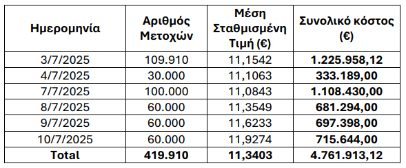 Η Εθνική Τράπεζα της Ελλάδος Α.Ε. («η Τράπεζα»), σε συνέχεια των αποφάσεων της από 30/05/2025 Τακτικής Γενικής Συνέλευσης των Μετόχων της και της από 04/06/2025 ανακοίνωσής της αναφορικά με την έναρξη υλοποίησης του πρώτου σκέλους του προγράμματος αγοράς ιδίων μετοχών που εγκρίθηκε από την ως άνω Γενική Συνέλευση (Σκέλος I), και κατόπιν της από 28/05/2025 σχετικής έγκρισης του Ενιαίου Εποπτικού Μηχανισμού (EEM) της Ευρωπαϊκής Κεντρικής Τράπεζας (ΕΚΤ) και των από 16/06/2025, 26/06/2025 και 04/07/2025 ανακοινώσεών της σχετικά με την αγορά ιδίων μετοχών, ανακοινώνει ότι κατά την περίοδο από 03/07/2025 έως και 10/07/2025 απέκτησε συνολικά 419.910 κοινές μετοχές της Τράπεζας (“Ίδιες Μετοχές”) που διαπραγματεύονται στο Χρηματιστήριο Αθηνών με μέση σταθμισμένη τιμή €11,3403 ανά μετοχή και με συνολικό κόστος €4.761.913,12.