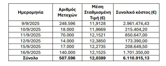 Η Εθνική Τράπεζα της Ελλάδος Α.Ε., σε συνέχεια των αποφάσεων της από 30/05/2025 Τακτικής Γενικής Συνέλευσης των Μετόχων της και της από 04/06/2025 ανακοίνωσής της αναφορικά με την έναρξη υλοποίησης του πρώτου σκέλους του προγράμματος αγοράς ιδίων μετοχών που εγκρίθηκε από την ως άνω Γενική Συνέλευση (Σκέλος I), και κατόπιν της από 28/05/2025 σχετικής έγκρισης του Ενιαίου Εποπτικού Μηχανισμού (EEM) της Ευρωπαϊκής Κεντρικής Τράπεζας (ΕΚΤ) και των από 16/06/2025, 26/06/2025, 04/07/2025, 14/07/2025, 21/07/2025, 29/07/2025, 07/08/2025, 18/08/2025, 26/08/2025, 02/09/2025 και 09/09/2025 ανακοινώσεών της σχετικά με την αγορά ιδίων μετοχών, ανακοινώνει ότι κατά την περίοδο από 09/09/2025 έως και 16/09/2025 απέκτησε συνολικά 507.596 κοινές μετοχές της Τράπεζας (“Ίδιες Μετοχές”) που διαπραγματεύονται στο Χρηματιστήριο Αθηνών με μέση σταθμισμένη τιμή €12,0389 ανά μετοχή και με συνολικό κόστος €6.110.915,13.
