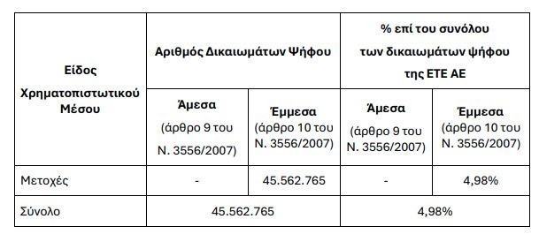Σε συνέχεια σχετικής γνωστοποίησης σημαντικών αλλαγών στα δικαιώματα ψήφου της Τράπεζας από την “Principal Global Investors, LLC” σύμφωνα με τον Ν. 3556/2007, καθώς και της από 23.01.2026 γνωστοποίησης που έλαβε η Τράπεζα από την “Principal Financial Group”, υπό την ιδιότητά της ως τελική μητρική εταιρεία της “Principal Global Investors, LLC”, η Τράπεζα γνωστοποιεί με την παρούσα, ότι το συνολικό ποσοστό δικαιωμάτων ψήφου τα οποία αντιστοιχούν σε ισάριθμες κοινές, ονομαστικές, μετά ψήφου, άυλες μετοχές που κατέχει έμμεσα η “Principal Financial Group”, από την ημερομηνία που αυτά περιήλθαν στην κατοχή της “Principal Global Investors, LLC”, κατήλθε στις 21.01.2026 του ελάχιστου ορίου του 5% επί του συνόλου των δικαιωμάτων ψήφου της Τράπεζας.