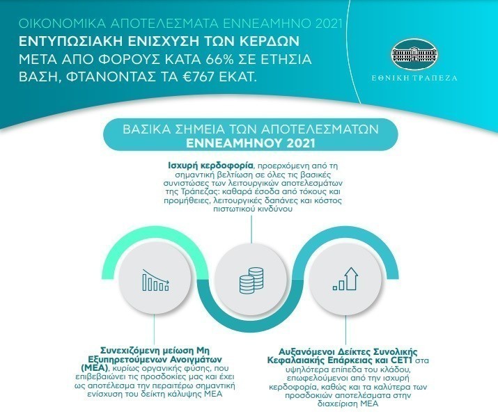 Αύξηση στα καθαρά κέρδη κατά 66% σε ετήσια βάση στο εννεάμηνο 2021, στα 767 εκατ. ευρώ , ανακοίνωσε η Εθνική Τράπεζα στα οικονομικά της αποτελέσματα.