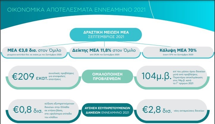 Ως αποτέλεσμα, ο δείκτης κάλυψης Μη Εξυπηρετούμενων Ανοιγμάτων από σωρευτικές προβλέψεις αυξήθηκε στο άκρως ικανοποιητικό ποσοστό του 70%, με υψηλές εμπράγματες εξασφαλίσεις, κυρίως ακίνητα, παρά τη συνεχιζόμενη σταδιακή αποκλιμάκωση του κόστους πιστωτικού κινδύνου στις 94μ.β. το Γ’ τρίμηνο 2021. Συνολικά, ο δείκτης Μη Εξυπηρετούμενων Ανοιγμάτων στην Ελλάδα διαμορφώθηκε στο 11,9%, με το υπόλοιπο Μη Εξυπηρετούμενων Ανοιγμάτων να ανέρχεται σε €3,7 δισ. και €1,1 δισ. μετά από προβλέψεις. Όσον αφορά τις συναλλαγές, η τιτλοποίηση Frontier αναμένεται να ολοκληρωθεί σε μερικές εβδομάδες.