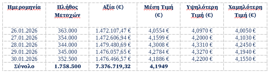 Η «Τράπεζα Eurobank Ανώνυμη Εταιρεία» (εφεξής η «Eurobank» ή η «Τράπεζα»), σε συνέχεια της από 12.12.2025 ανακοίνωσής της σχετικά με την έναρξη εφαρμογής του Προγράμματος Επαναγοράς Ιδίων Μετοχών («Πρόγραμμα»), το οποίο εγκρίθηκε με την απόφαση της Έκτακτης Γενικής Συνέλευσης των Μετόχων της Τράπεζας στις 22.10.2025, σύμφωνα με το άρθρο 49 του ν. 4548/2018, σε συνέχεια του αντίστοιχου προγράμματος της «Eurobank Ergasias Υπηρεσιών και Συμμετοχών Ανώνυμη Εταιρεία» («Eurobank Holdings») που θεσπίστηκε με την απόφαση της από 30.04.2025 Τακτικής Γενικής Συνέλευσης των Μετόχων της τελευταίας, και σε συνέχεια της από 22.10.2025 απόφασης του Διοικητικού Συμβουλίου της, ενημερώνει το κοινό ότι κατά το διάστημα 26.01.2026 – 30.01.2026 απέκτησε συνολικά, στο πλαίσιο του Προγράμματος, 1.758.500 μετοχές εκδόσεως της ιδίας («Ίδιες Μετοχές») που διαπραγματεύονται στο Χρηματιστήριο Αθηνών («Χ.Α.»), με μέση τιμή κτήσης €4,1949 ανά μετοχή και συνολικό κόστος €7.376.719,32.