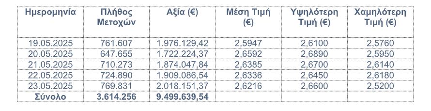 Η «Eurobank Ergasias Υπηρεσιών και Συμμετοχών Ανώνυμη Εταιρεία» («Eurobank Holdings»), σε συνέχεια της από 07.05.2025 ανακοίνωσής της σχετικά με την έναρξη εφαρμογής του Προγράμματος Επαναγοράς Ιδίων Μετοχών («Πρόγραμμα»), που εγκρίθηκε με την απόφαση της Τακτικής Γενικής Συνέλευσης των Μετόχων της Eurobank Holdings στις 30.04.2025 και σε συνέχεια της από 30.04.2025 απόφασης του Διοικητικού Συμβουλίου της, ενημερώνει το κοινό ότι κατά το διάστημα 19/5/2025 – 23/05/2025 απέκτησε συνολικά, στο πλαίσιο του Προγράμματος, 3.614.256 μετοχές εκδόσεως της ιδίας («Ίδιες Μετοχές») που διαπραγματεύονται στο Χρηματιστήριο Αθηνών («Χ.Α.»), με μέση τιμή κτήσης €2,6284, ανά μετοχή και συνολικό κόστος €9.499.639,54. Συγκεκριμένα, πραγματοποιήθηκαν χρηματιστηριακώς μέσω του μέλους του Χ.Α. «Eurobank Equities Μονοπρόσωπη Ανώνυμη Εταιρεία Παροχής Επενδυτικών Υπηρεσιών» οι ακόλουθες αγορές: