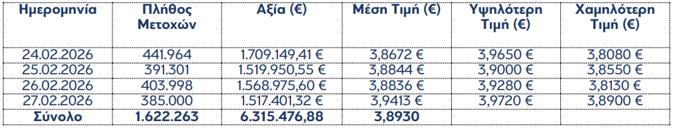 Η «Τράπεζα Eurobank Ανώνυμη Εταιρεία» (εφεξής η «Eurobank» ή η «Τράπεζα»), σε συνέχεια της από 12.12.2025 ανακοίνωσής της σχετικά με την έναρξη εφαρμογής του Προγράμματος Επαναγοράς Ιδίων Μετοχών («Πρόγραμμα»), το οποίο εγκρίθηκε με την απόφαση της Έκτακτης Γενικής Συνέλευσης των Μετόχων της Τράπεζας στις 22.10.2025, σύμφωνα με το άρθρο 49 του ν. 4548/2018, σε συνέχεια του αντίστοιχου προγράμματος της «Eurobank Ergasias Υπηρεσιών και Συμμετοχών Ανώνυμη Εταιρεία» («Eurobank Holdings») που θεσπίστηκε με την απόφαση της από 30.04.2025 Τακτικής Γενικής Συνέλευσης των Μετόχων της τελευταίας, και σε συνέχεια της από 22.10.2025 απόφασης του Διοικητικού Συμβουλίου της, ενημερώνει το κοινό ότι κατά το διάστημα 24.02.2026 – 27.02.2026 απέκτησε συνολικά, στο πλαίσιο του Προγράμματος, 1.622.263 μετοχές εκδόσεως της ιδίας («Ίδιες Μετοχές») που διαπραγματεύονται στο Χρηματιστήριο Αθηνών («Χ.Α.»), με μέση τιμή κτήσης €3,8930 ανά μετοχή και συνολικό κόστος €6.315.476,88.